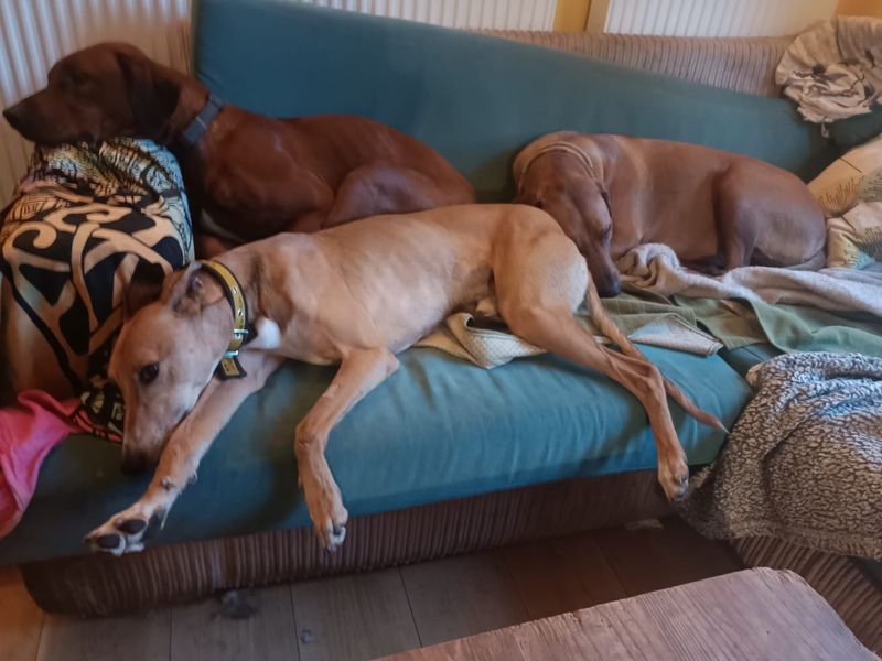 Are you right for Duplo?Meet Duplo - a 4 year old a handsome lurcher who cannot wait to find his new home! Duplo is currently in foster with one of our amazing foster carers and is absolutely thriving! He is in foster with multiple other dogs and this has really helped him settle and as you can see from his photos, he loves to cuddle on the sofa with them as well. Duplo does still showing some behaviours, like counter surfing, that the foster carer is working on. Duplo can get over aroused and therefore is looking for a home that can help him with these behaviours. He can live with older secondary school aged children. Duplo is also house trained in foster and has the use of a dog flap, so he can go in and out as he pleases.