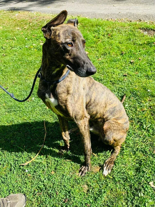 Finn is a wonderful lurcher aged around 4–5 years old with a heart of gold. His start in life was incredibly tough – he was cruelly abandoned, tied up with a choke chain, and in his panic to escape he almost strangled himself. The pressure caused burst blood vessels in both eyes, but thanks to care and time he has made an amazing recovery.Despite what he’s been through, Finn has shown himself to be an absolute superstar. He is completely dog neutral, walks beautifully on the lead, and has learned that he can trust again. This sweet boy loves affection and will happily offer up his face for rubs – it’s his favourite thing!Finn has had his first vaccination and is now ready to find the loving forever home he so deserves. He’s brave, affectionate and gentle – the very best of dogs – and he’ll make a truly special companion for someone.Finn is 25 TTS and 27.5kg. Finn is now in foster in Surrey.