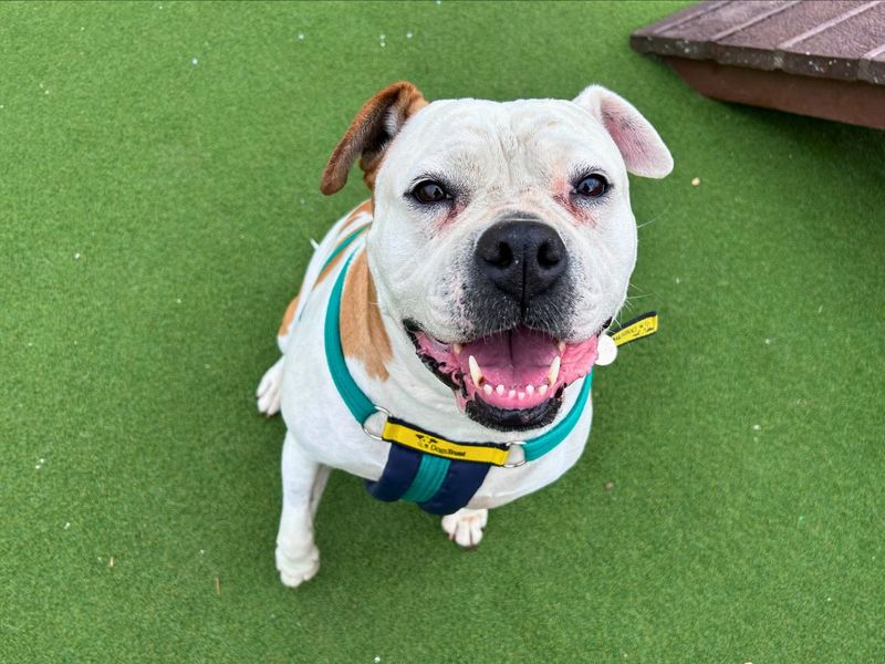 Are you right for Gloria?Gloria is a gorgeous 8-year-old American Bulldog with a huge heart and an even bigger love of people. She’s a friendly, wag-from-the-waist kind of girl who greets everyone like an old friend and adores being part of whatever’s going on. Gloria would love a home where she can enjoy plenty of fuss and companionship, along with a private garden to potter and play in. She’d prefer to be the only pet in the home, but she’s happy to say hello to polite dogs out and about. A quieter walking area suits her best, but at home she’s full of warmth, affection and character — the perfect mix of gentle and goofy.
