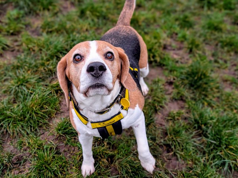 Are you right for Hazel?Meet gorgeous Hazel, a 7-year old Beagle looking for her forever home! Hazel needs to be rehomed with her friend, Buster, as they are a bonded pair. Hazel would love a home where all children are 11yrs+. Hazel is a very sweet angel, who loves getting out for a slow, sniffy potter about followed by a big cuddle on the sofa with her people. Hazel is social with other dogs out and about, enjoying a good parallel walk with her buddies and enjoys meeting new friends. Hazel is a super foodie girl, though she is currently on a diet, but this will help with any training she may need. She has been left alone for 4-6 hours with a break in her previous home, so there is scope for this to be the case in her new home once she's settled in! Hazel walks wonderfully on lead, and enjoys having her nose to the ground in true Beagle fashion.