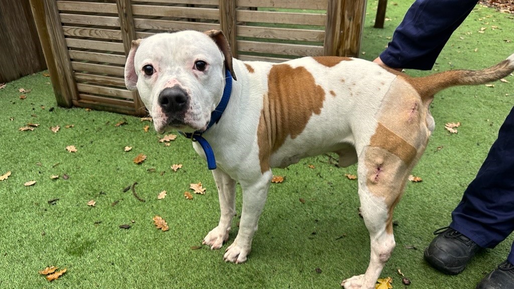 Kilo is a fun loving, excitable, American Bulldog based at our Old Windsor site.Being a young large dog he can forget his size and show some over the top behaviours around new people and dogs. Due to this he will need a private secure garden where he can run around and burn off energy. Kilo has been working on some training to help him with his manners in these situations, and this will need to be continued in his new home.He has been social with other dogs, and he really enjoys playing with them. But he can become too much for other dogs, and he does need support in this area to help develop his social skills.He loves meeting new people and is very enthusiastic when he greets them. He will need some reminders in his next home to keep all four paws on the ground.Kilo will be an exuberant new family member for a home looking for a fun dog that will enjoy going on long walks and zooming around the garden chasing squeaky toys.If you have already completed our online rehoming form and woul...