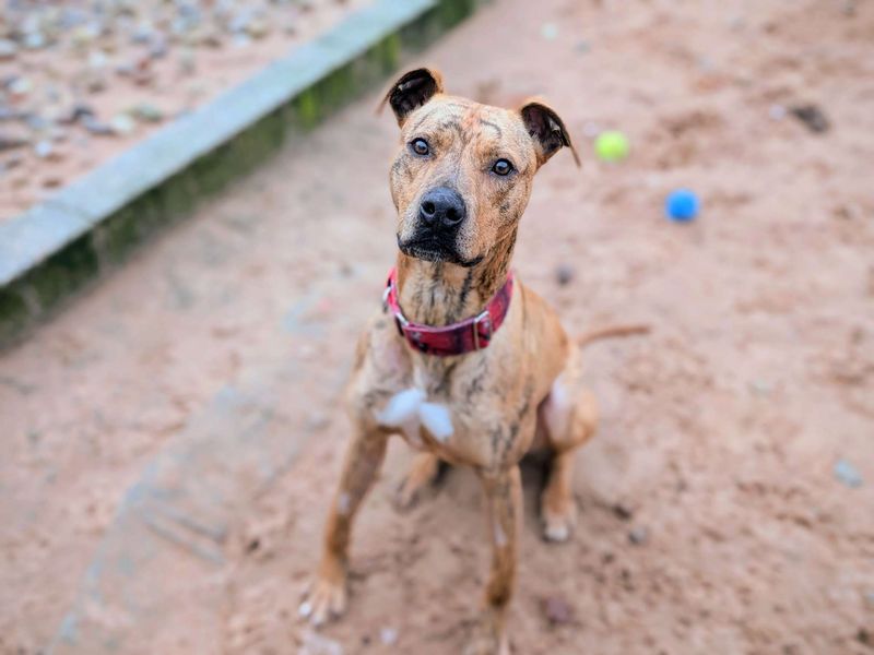 Are you right for Tiger?Tiger is a happy chappy wanting to make friends with every person he meets! Full of energy and fun but also a calm natured lad, Tiger is 1year and 7months so has lots of energy for a fun household. You'll get the best of both words with Tiger because he settles well when you need him to but also has the energy for some fun adventures! Tiger can live with children the ages 11+ and although not able to live with another dog currently, he can have calm larger doggy friends! Tiger came into our care as a a stray from another rescue so we don't have any history for him, but he is proving to be a staff favorite here at the centre. Tiger has lots of love to give and he is a striking Brindle boy with unique front legs which don't cause him any issues, he's just a little bit Bendy on his front legs!